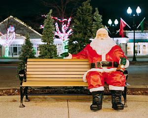 Santa Claus sits on a bench in an empty Historic Downtown Greendale, WI during the pandemic. Portra 800 shot on a Mamiya RB67. Photo by Brian Huynh